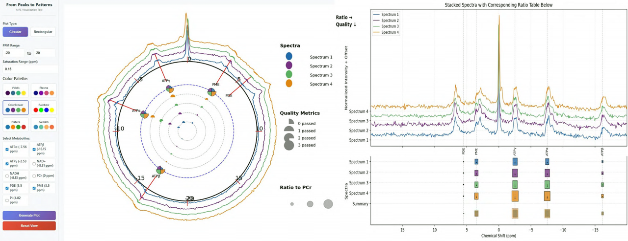 Publication: IEEE Vis 2025 (Bio+MedVis Challenge Poster), Vienna, Austria, IEEE URL: http://biovis.net/2025/biovisChallenges_vis/ MRS is a non-invasive way of gaining information about cellular metabolism and can be used to study neurological and metabolic disorders. However, the clinical utility is limited by low signal quality, overlapping spectral peaks, and the inability to interpret and compare metabolite data. We developed an interactive visual analysis system that integrates methods for filtering, quality measurement, and comparative summaries of MRS signals, enabling researchers to more effectively evaluate and interpret spectral data. This will allow researchers to perform a more accurate evaluation of spectral data, which will help them understand the molecular processes behind the complex neurological and metabolic processes in greater depth. Index Terms: Glyph-based Visualization, Quality Metrics, Multimodal Visualization. Date: November 2, 2025 - November 7, 2025 Document: View PDF |